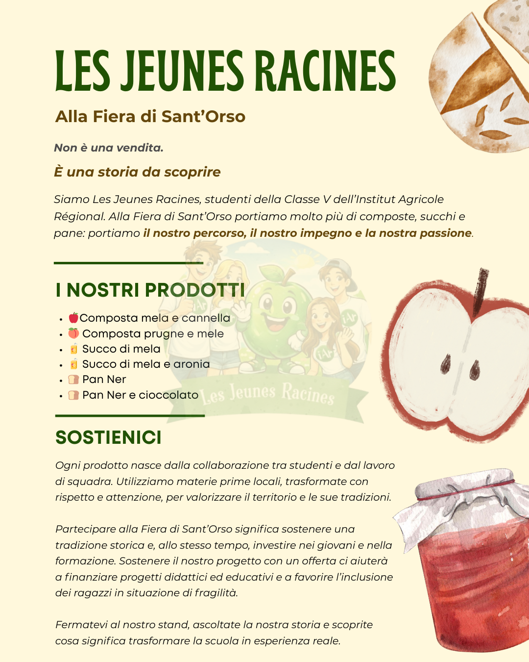 Ogni barattolo, ogni bottiglia di succo, ogni forma di pane ha un valore aggiunto invisibile: finanziare progetti didattici e attività educative favorendo anche l’inclusione di ragazzi in situazione di fragilità. Lasciare un offerta ai Les Jeunes Racines significa investire nella formazione, sostenere chi sta imparando a trasformare passione e studio in competenze reali.