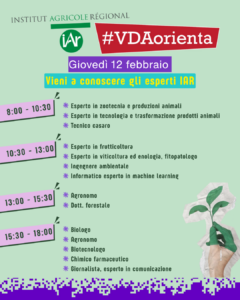 Il 12 febbraio l’Institut Agricole Régional cambia veste: saranno i ricercatori, molti dei quali anche docenti, a presentare le figure professionali che operano nelle attività di ricerca e sperimentazione al servizio dell’agricoltura di montagna. Un’occasione preziosa per scoprire i percorsi accademici e i corsi professionalizzanti che permettono di lavorare in questo settore. I visitatori potranno così avere una visione completa della Fondazione e delle molteplici opportunità per chi desidera costruire il proprio futuro in questo ambito.